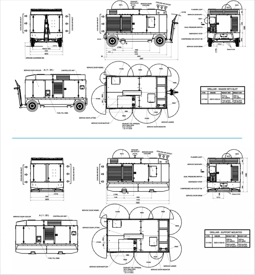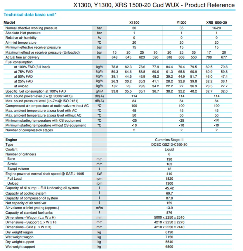 Atlas Copco X1300, Y1300 и XRS 1500-20 са безшумни двустепенни винтови компресори с впръскване на масло, задвижвани от шестцилиндров дизелов двигател Cummins с течно охлаждане.