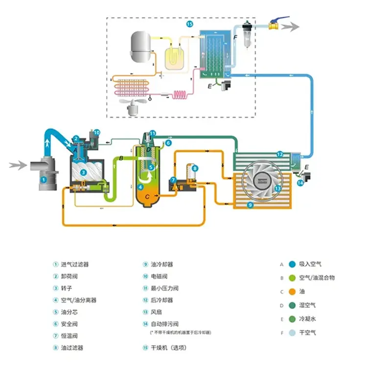 2. Спомагателни системи: включително системата за смазочно масло, системата за охлаждаща вода, електрическата система за управление и т.н., се използват за осигуряване на нормалната работа на въздушния компресор.