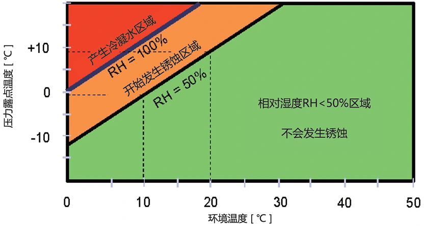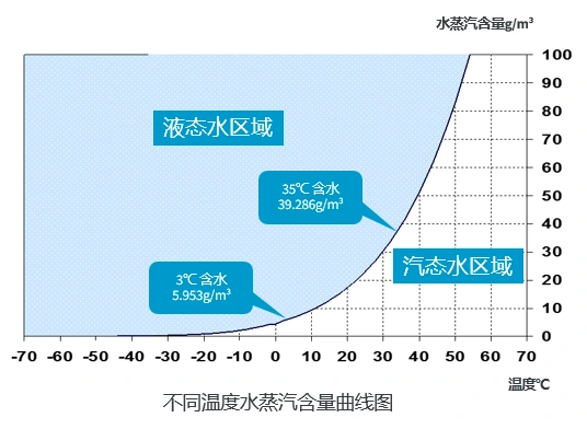 Фигурата показва, че въздухът съдържа различни количества водна пара при различни температури. Въздухът се охлажда и нивото на водните му пари също намалява. Кривата има точки, които маркират нивата на наситена водна пара. Температурата за всяка от тези точки е точката на оросяване. По-ниската точка на оросяване означава по-малко водни пари в сгъстения въздух. Хладилните сушилни за въздух използват това физическо правило. Те позволяват сгъстен въздух да замени топлината с хладилен агент. Това действие понижава температурата на сгъстения въздух. Водната пара на охладения въздух се превръща в течна вода. Тази течност се източва от системата. Например съдържанието на наситени водни пари в сгъстен въздух при 35 ℃ е 39,286 g/m³. След топлообмен с хладилния агент и охлаждане до 3 ℃, съдържанието на наситени водни пари е 5,953g /m³. Разликата от 33,333 g /m³ показва количеството вода, отстранено след охлаждане и дехидратация от сушилнята за замразяване. Тоест, след като сгъстеният въздух премине през сушилнята за замразяване, приблизително 85% от влагата се отстранява, което гарантира, че изсушаването на сгъстения въздух отговаря на изискванията на производствения процес.
