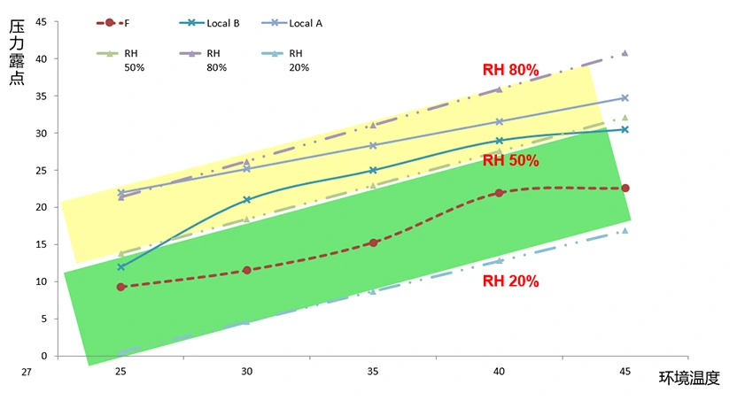 Както е показано в измерените данни по-долу, при входящо налягане на сгъстен въздух от 7 бара, входяща температура от 35°C, точка на оросяване под налягане от 7°C и крайна изходяща температура от 25°C, относителната влажност на въздуха е 30%, ефективно предотвратявайки корозията на тръбопроводите и оборудването, използващо въздух.