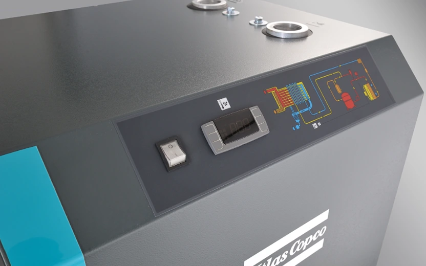 Хладилният въздушен изсушител тип F на Atlas Copco използва топлообменник три в едно, който комбинира сепаратори въздух/въздух, въздух/хладилен агент и вода. Това ефективно премахва течната вода, отделена след охлаждане, и предварително охлажда сгъстения въздух, подобрявайки ефективността на топлообмена.