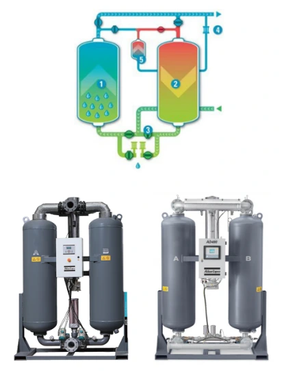 Микротермично регенеративните адсорбционни сушилни A-серия използват десикант за адсорбиране на влага от сгъстен въздух. Всяка машина се състои от две еднакви кули. Те сменят функциите си след всеки цикъл.