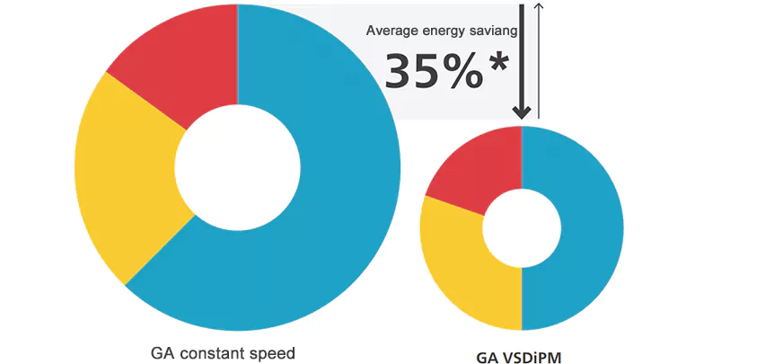 Високоефективните компресори от серията VSDiPM спестяват средно до 35%* енергия в сравнение с компресори, работещи при определени скорости